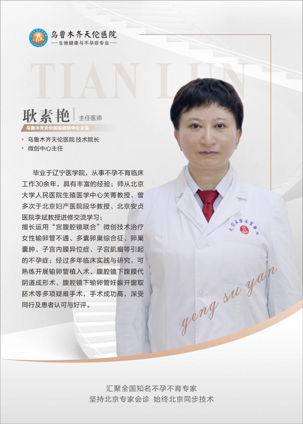 耿素艳 【主任医师】乌鲁木齐天伦医院 技术院长、微创中心主任毕业于辽宁医学院,从事不孕不育临床工作30余年,具有丰富的经验;师从北京大学人民医院生殖医学中心关菁教授,曾多次于北京妇产医院段华教授、北京安贞医院李斌教授进修交流学习; 擅长运用“宫腹腔镜联合”微创技术治疗女性输卵管不通、多囊卵巢综合征、卵巢囊肿、子宫内膜异位症、子宫肌瘤等引起的不孕症;经过多年临床实践与研究,可熟练开展输卵管植入术、腹腔镜下腹膜代阴道成形术、腹腔镜下输卵管妊娠开窗取胚术等多项疑难手术,手术成功高,深受同行及患者认可与好评。
